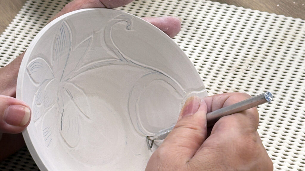 中国宋時代の名窯で、磁器質の白磁を最初に完成させた窯と言われています。 酸化焼成で象牙色の柔らかな表面に片切彫りで表現された文様が特徴です。 当講座では、講師自作の生地に定窯風の片切彫りを体験して頂きます。